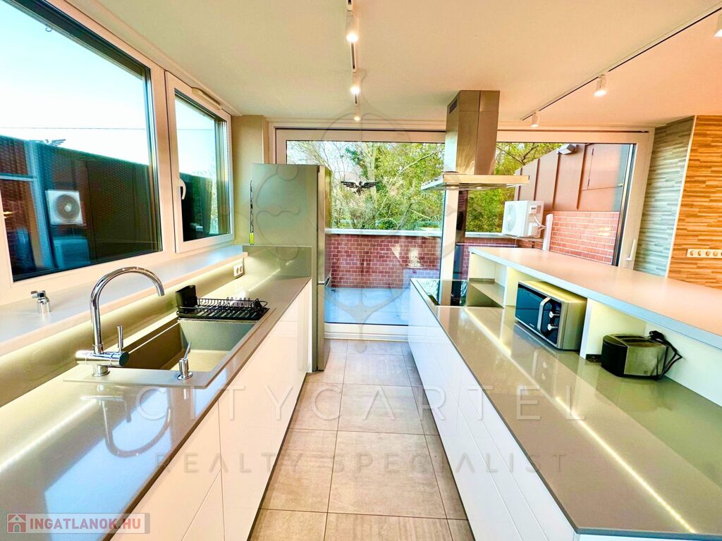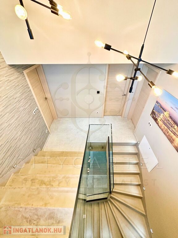 A belső terek visszafogott eleganciát és kifinomult minimalizmust sugároznak. A nappali tágas, természetes fényben úszik, a felső szint pedig egy panorámás teraszkomplexummal koronázza meg az ingatlant – tökéletes helyszín pihenésre vagy reprezentatív eseményekre.