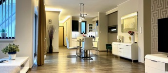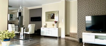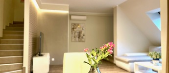 Built in 2014 as a penthouse extension, the apartment features a minimalist design, high-quality materials, and a peaceful, elegant atmosphere.