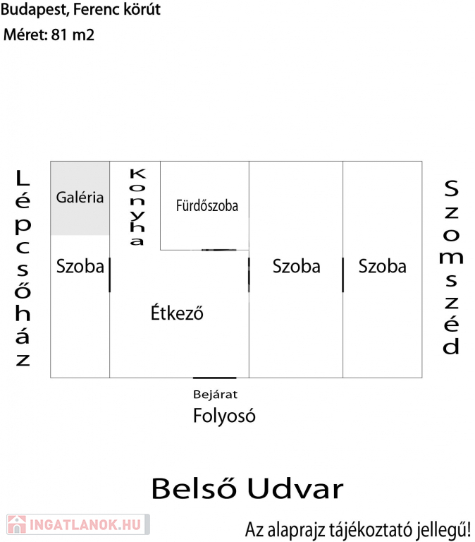 A lakás az első emeleten helyezkedik el, 3 szobából, étkezőből, főzőfülkéből és fürdőszobából áll.