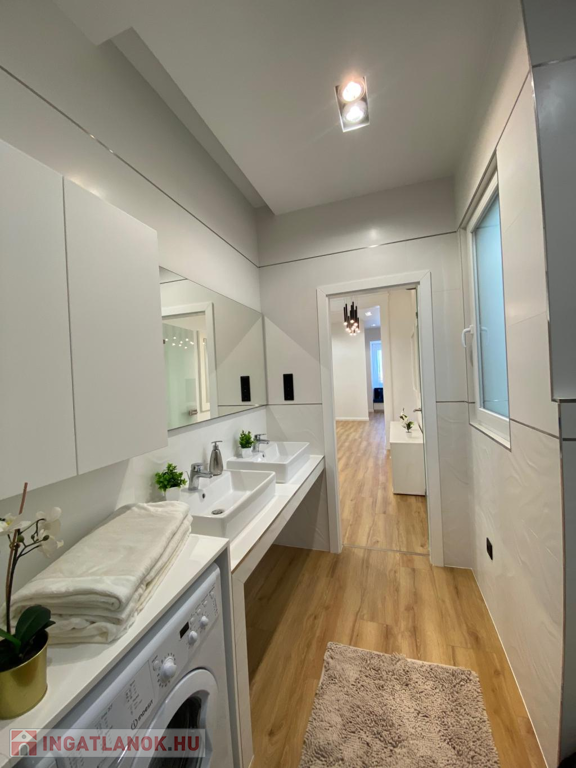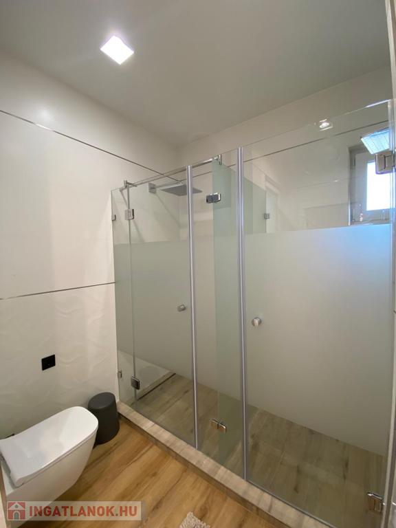 A fürdőszoba elegáns burkolatokkal, két különálló zuhanyzóval és WC-vel rendelkezik, így akár két személy is kényelmesen, egymástól függetlenül készülődhet reggelente. Az ablakos kialakításnak köszönhetően jól szellőztethető.