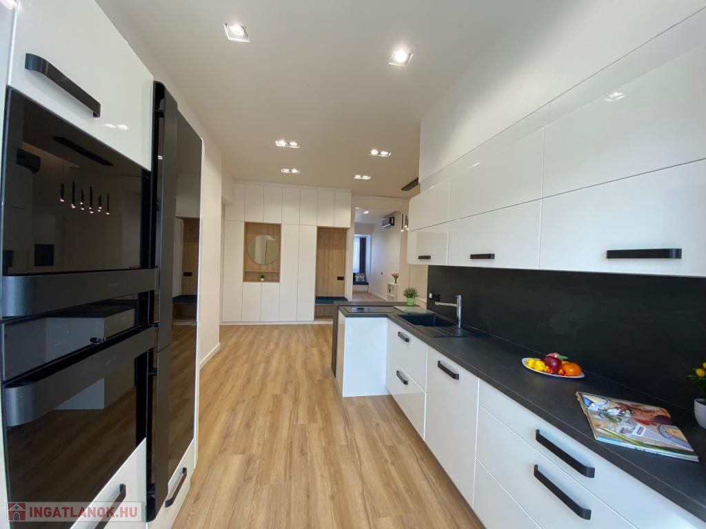 A konyha teljesen gépesített, modern beépített bútorokkal, minőségi készülékekkel (hűtő, fagyasztó, főzőlap, sütő, elszívó, mosogatógép, mikró), ideális hely egy kellemes étkezésre vagy esti beszélgetésekhez.