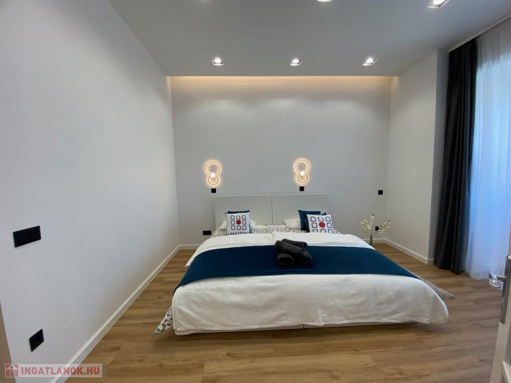 A nappaliból elérhető hálószoba nyugodt, csendes légkört biztosít, a hozzá kapcsolódó, külön gardróbhelyiség pedig praktikus és stílusos megoldás minden igényes bérlő álma.