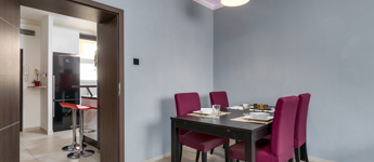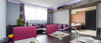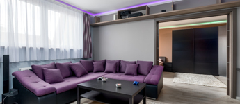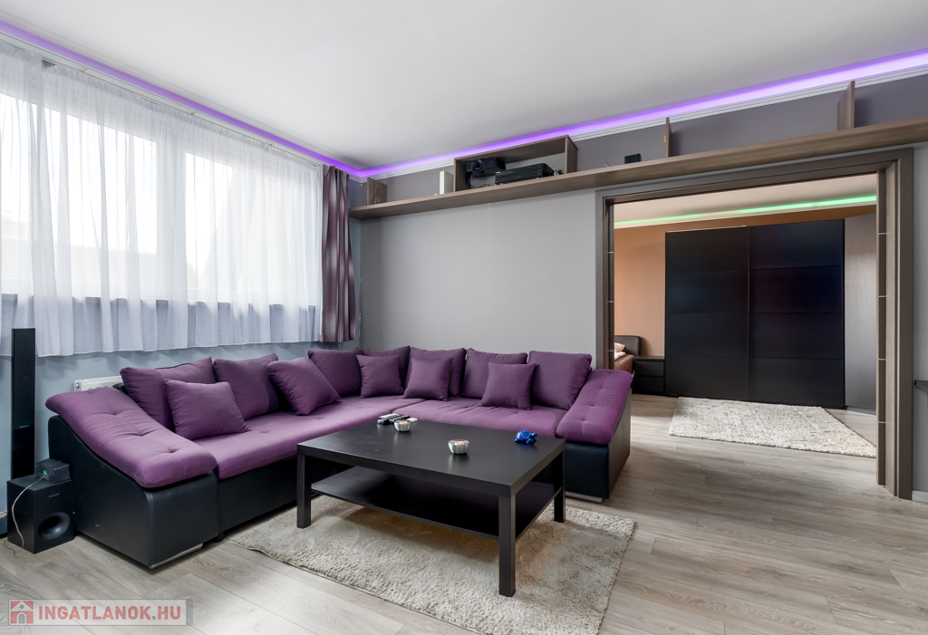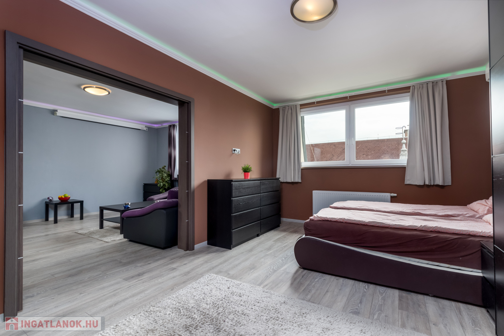 A nappali és a hálószoba egy nagyméretű falban futó ajtóval van elválasztva, amely során a két szoba egybenyitásával egy hatalmas egybefüggő 45 m2 területet kapunk, bezárva pedig teljesen elszeparálható. A fürdőszoba és a WC külön helyiségben található.