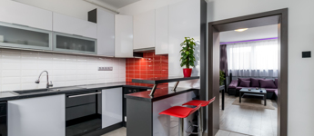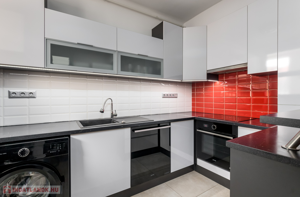 Az ingatlan bútorozott, gépesített: modern konyha új gépekkel felszerelve: indukciós főzőlap, hűtő és mosogatógép.