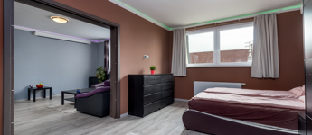The living room and bedroom are separated by a large door running in the wall, during which we get a huge continuous 45 m2 area when opening the two rooms together, and when closed, it can be completely separated. The bathroom and toilet are located in a separate room.