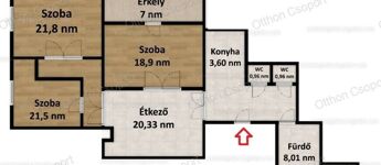 A 102 négyzetméteres ingatlan 3 külön nyíló szobát, egy külön konyhát, 2 WC-t és fürdőszobát foglal magába. A szobák nagyok, mindegyik több mint 20 négyzetméteres.