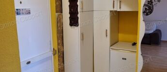 A konyhában gáztűzhely, hűtőszekrény, fagyasztó és mikró, a szobában könyvszekrény, kinyitható kanapé, TV, beépített szekrény található.