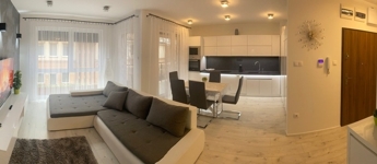 Az ingatlan bútorozott, háztartási gépekkel felszerelt. A konyhában beépített sütő, mikrohullámú, kerámialapos tűzhely, mosogatógép. A lakás nappali + 2 hálószoba, erkély, konyha, fürdőszoba helyiségekből áll. A wc és a fürdőszoba egy helyiségben található. Az ingatlan klimatizált, alumínium redőnnyel felszerelt.