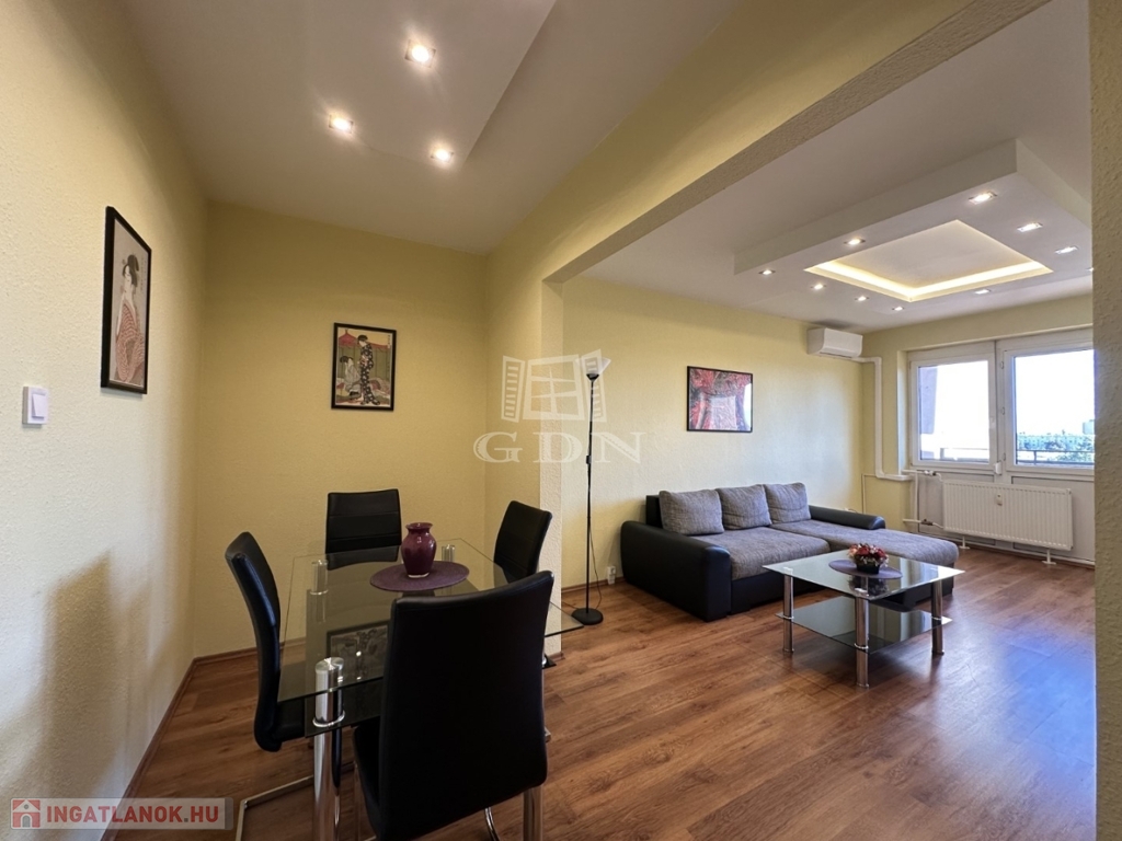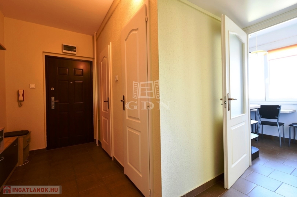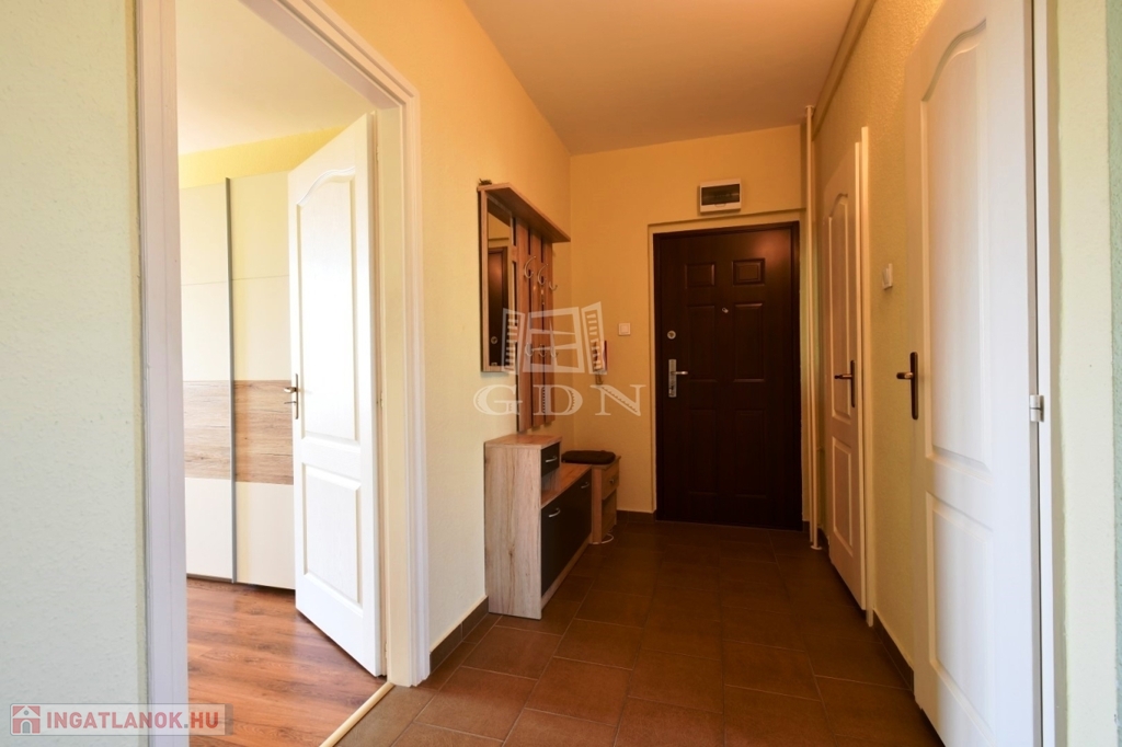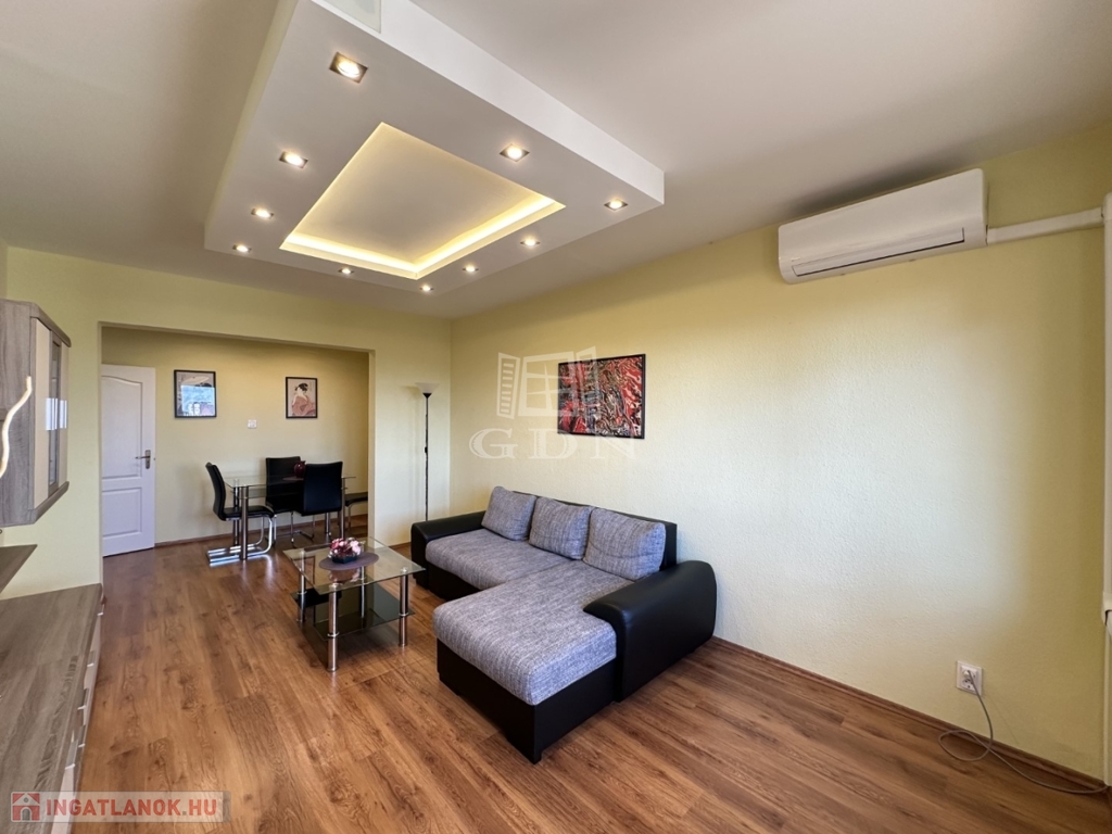 A 68nm-es lakásban minden új kívül és belül: a ház a panelprogramban részt vett, a tulajdonos pedig az összes beltéri ajtót, burkolatokat, konyhabútort, szanitereket, a gépészetet és a fűtőtesteket is kicserélte. A konyha és vizes helyiségek festettek, a közlekedő, a hall és a szobák falai festett fűrészporos tapétásak, járólap van a közlekedőben és vizes helyiségekben, laminált padló a szobákban. Az ablakok újak, műanyag hőszigeteltek, rajtuk redőny és szúnyogháló található. Tömegközlekedése kiváló, parkolás az épület előtt fizetős övezetben megoldott. Az épület körül számos bevásárlási lehetőség, gyorsétterem, és zöldövezeti park található. A belváros 5 perc séta távolságra elérhető.