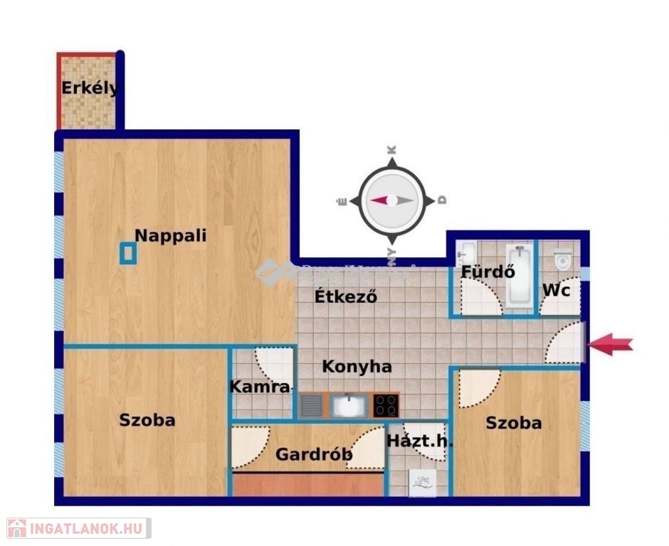 A lakás nagyon jó elosztású, konyha-étkező, tágas nappali, két hálószoba, erkély, külön gardrób, háztartási helyiség, kamra, fürdő és Wc külön található. A fűtése egyedi mérős házközpontifűtés.