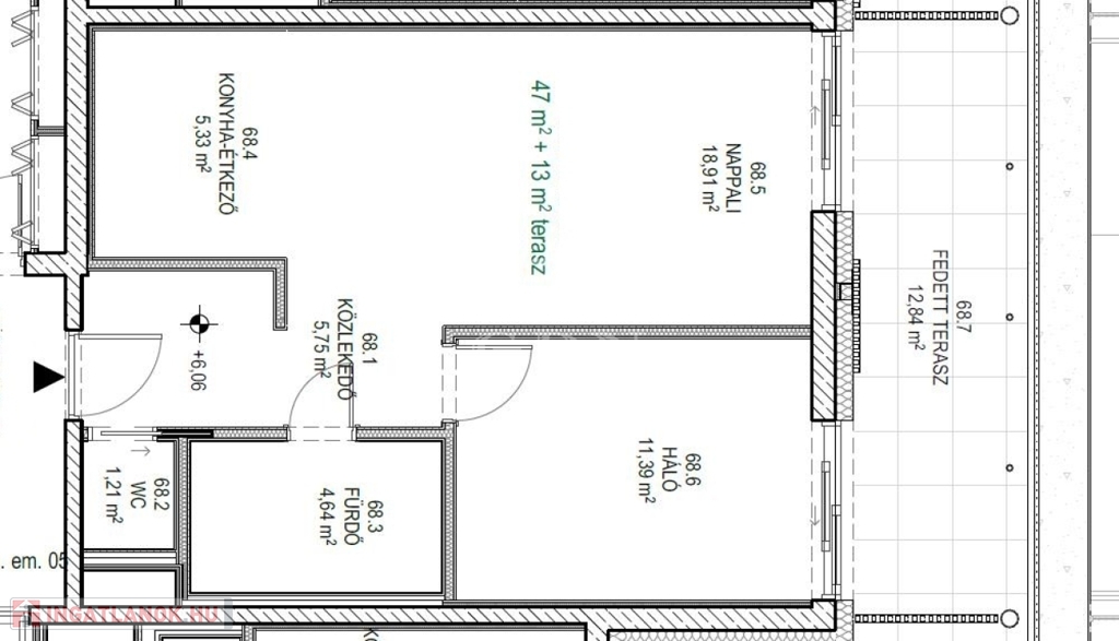 Ez a lakás nappali+1 hálós, 47nm alapterületű+ tartozik hozzá egy 13nm-es fedett terasz is.