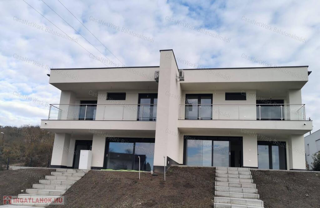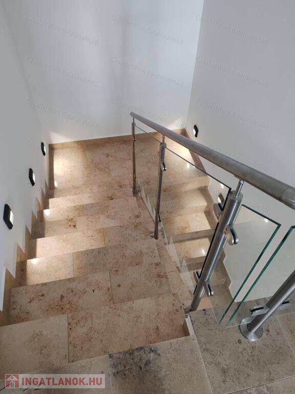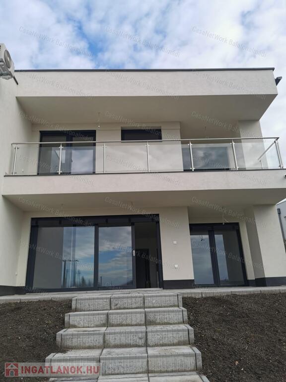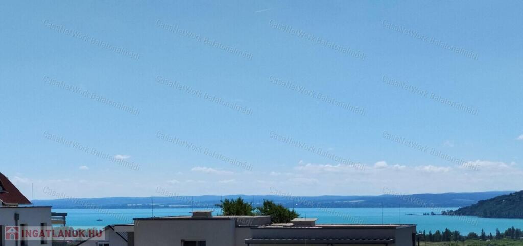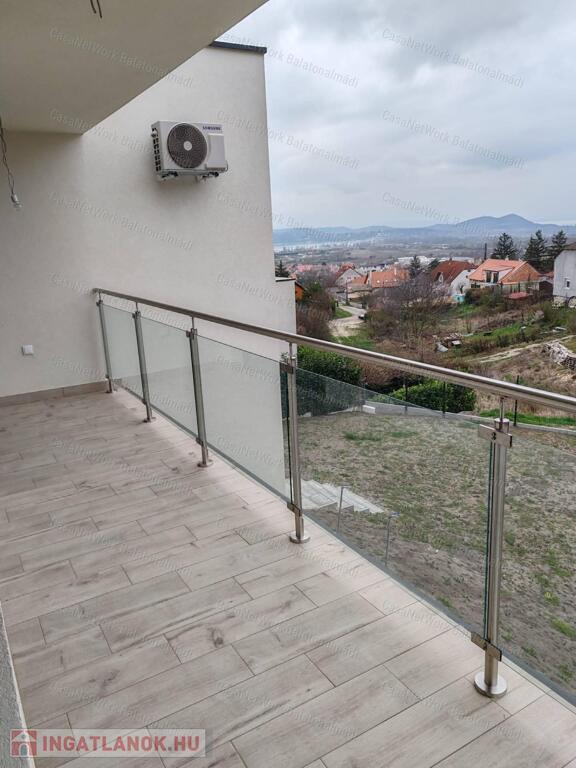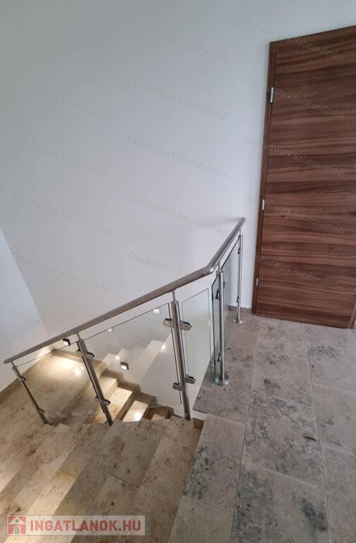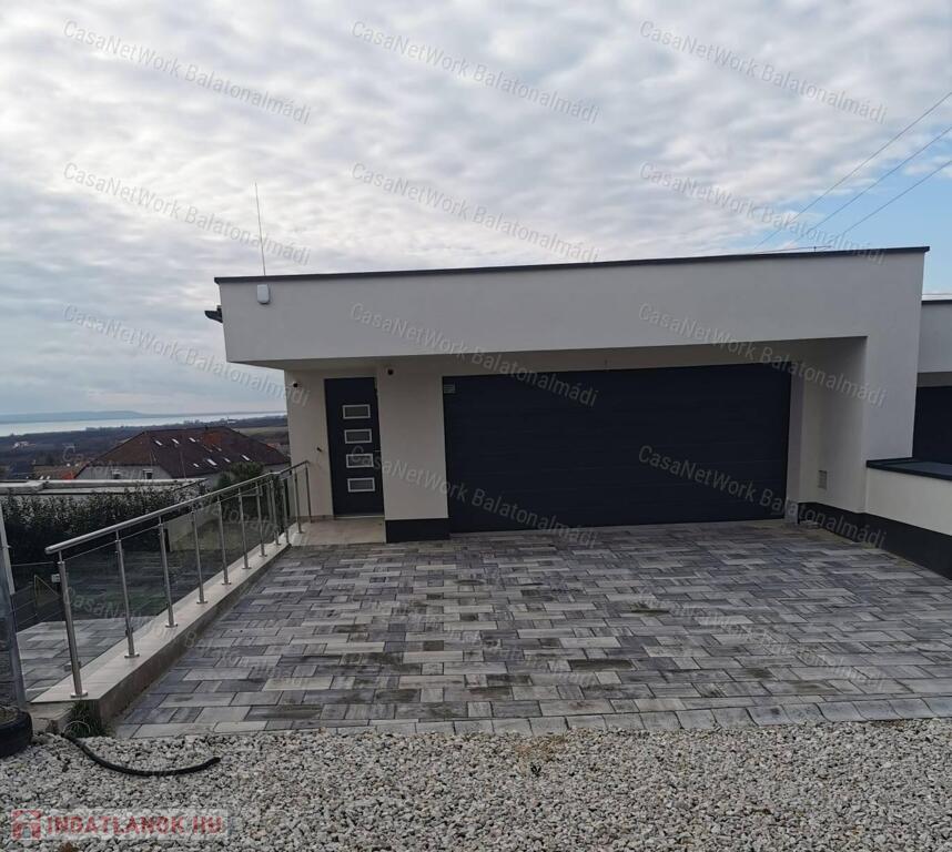 - emelet: kétállásos garázs, előtér, közlekedők, kettő erkélykapcsolatos szoba, fürdőszoba, háztartási helyiség, 16 m²-es fedett erkély, csodás panorámával a Balatonra
