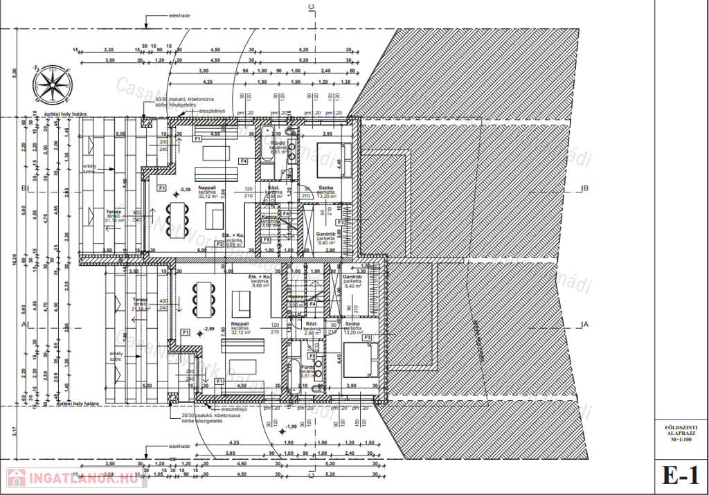 - földszint: közlekedő, fürdőszoba, kamra, egy szoba, gardrób, és amerikai konyhás nappali a különleges, 31 m²-es teraszhoz kapcsolódva