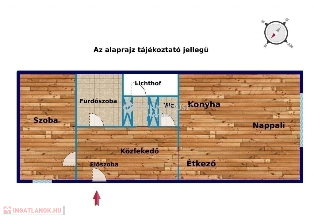 A lakás beosztása: tágas előszoba-közlekedő rengeteg tárolóhelyet biztosító beépített szekrényekkel, amerikai konyhás nappali, egy belső udvarra néző hálószoba, kádas fürdőszoba, gardrób, külön WC, valamint egy extra 3 m2-es kilépő.