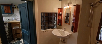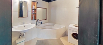 A fürdőszobában tágas sarokkádban fürödhetünk,a wc külön helyiségben kézmosóval is fel van