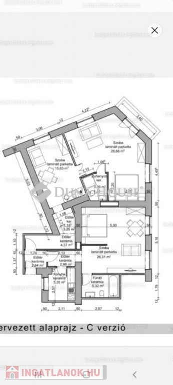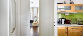 A lakás két apartmanra lett osztva, melynek bejáratai egy közös előszobából nyílnak. A nagyobbik lakrész 47 nm, helységei: előszoba, konyha étkezővel, fürdő WC-vel, zuhannyal, és egy 29 nm -es tágas sarokszoba, erkéllyel. A kisebbik lakrész 39 nm, helységei: előszoba, konyha, fürdő WC-vel, káddal, és egy 26 nm-es tágas szoba.