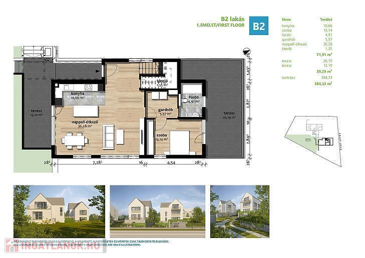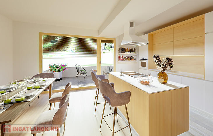 Az eladásra kínált lakás a társasház középső lakása, mely amerikai konyhás nappaliból, 3 hálószobából és 2 fürdőszobából áll. A nappaliból nyílik egy 20nm-es napfényes, kertkapcsolatos terasz. A természetközeliséget tovább fokozza a lakáshoz 338nm-es kizárólagos használatú kert.