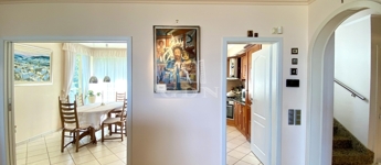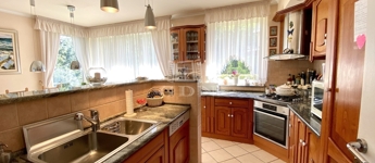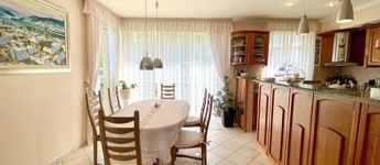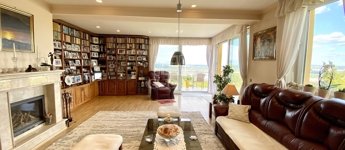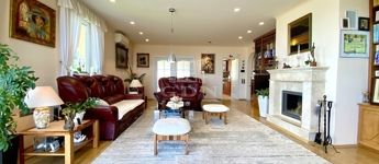 A hatalmas, 44 m2-es nappaliban egy gyönyörű márványkandalló kapott helyet, amely hűvösebb időben meghitt, kellemes hangulatot varázsol. A nappaliból egy üveg tolóajtóval elválasztott étkező és konyha nyílik. Ha akarjuk, egybenyithatjuk a két teret.