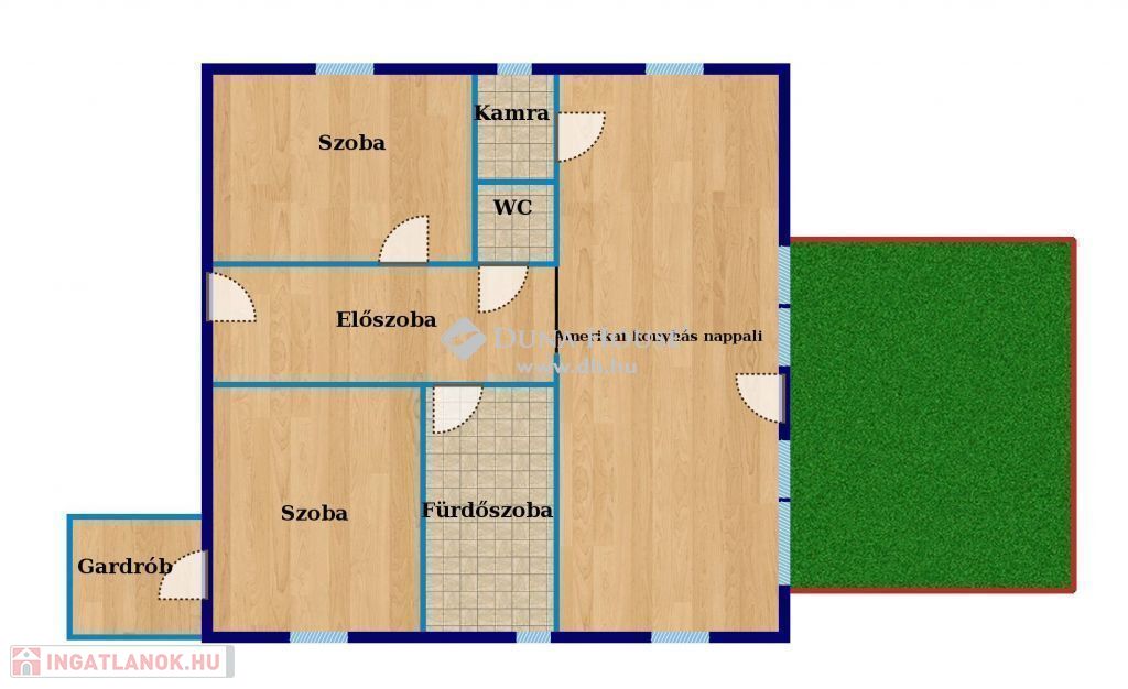 Az ingatlanban 2 hálószoba (az egyikhez gardrób is tartozik), egy amerikai konyhás nappali, egy fürdőszoba, egy külön mellékhelység, valamint egy kamra is található. Tartozik még hozzá egy 34,5 négyzetméteres terasz, illetve egy 200 négyzetméteres kert is.