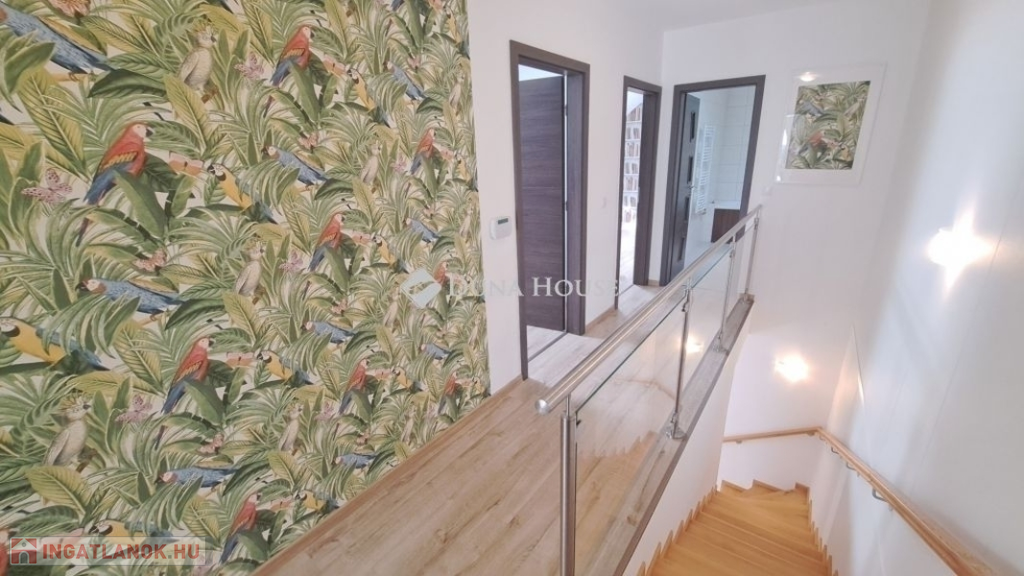 Maga az ingatlan belső kétszintes: a földszinten található hatalmas élettér ad otthont a konyhának és hozzá tartozó tárolónak, étkezőnek, mosdónak, valamint a közvetlen terasz és kertkapcsolatos nappalinak. Tökéletes teret nyújt majd a helyiség Önnek és családjának egész évben. Igény esetén kialakítható még itt egy kandalló is, a tökéletes őszi-téli hangulat megteremtéséhez. Az emelet ad otthont a három hálószobának és emeleti fürdőszobának. Az alagsorban angol aknával bevilágított mosókonyha található, valamint innen közelíthető meg egy közös tároló és a teremgarázs is. A lakáshoz kötelezően megvásárolandó egy dupla felszíni parkoló és teremgarázsbeálló is, ezek együttes értéke 20.000.000 Ft.