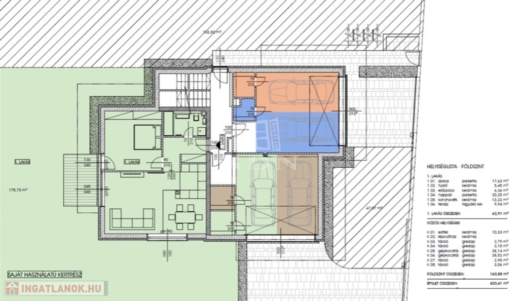 Alapterület: 62,91 m² + 9,94 m² terasz + 133,82 m² kizárólagos használatú kert