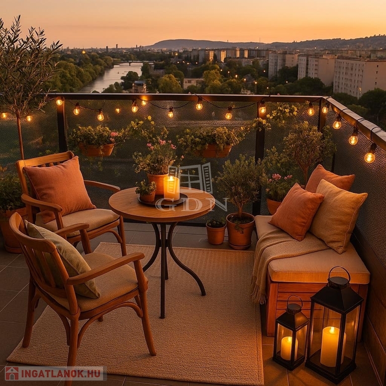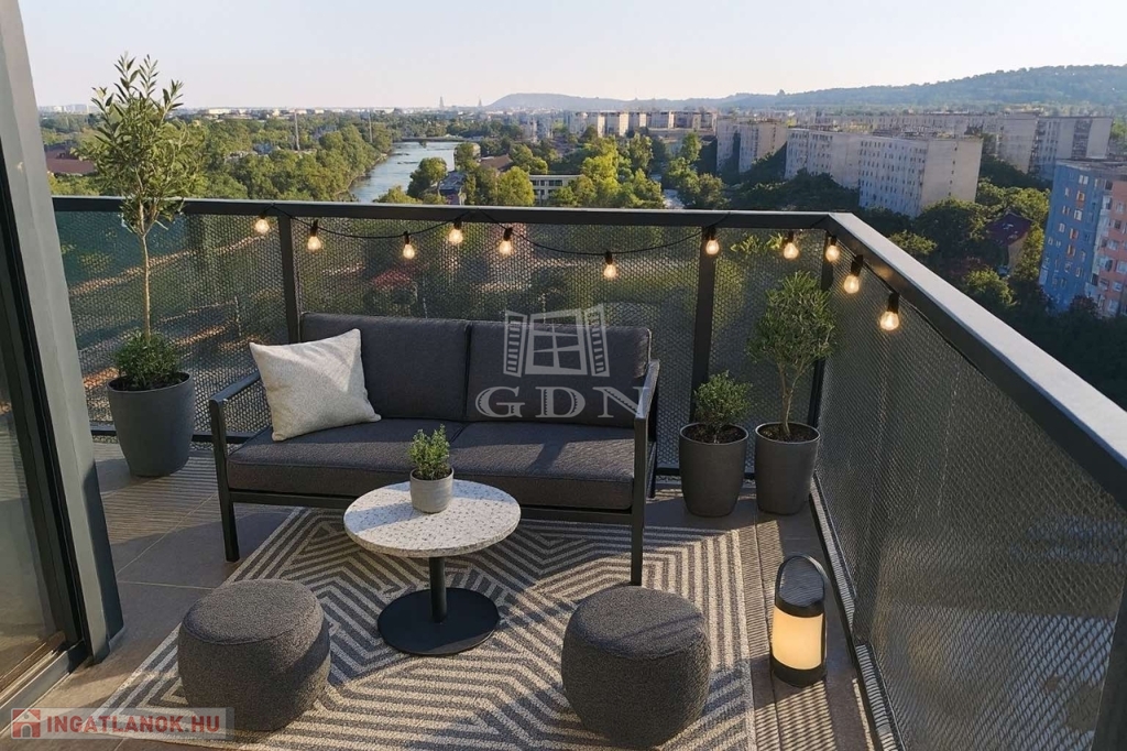 A 18 m²-es, panorámás erkély közvetlenül megközelíthető a nappaliból és mindkét hálószobából – ideális helyszín a reggeli kávéhoz, naplementéhez vagy egy esti borozáshoz a város fényeiben gyönyörködve.
