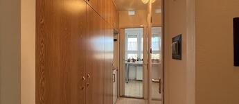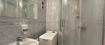 A fürdőszoba új burkolatot kapott, zuhanykabinos. A mosógép be-és kiállása is ebben a helyiségben lett kialakítva.