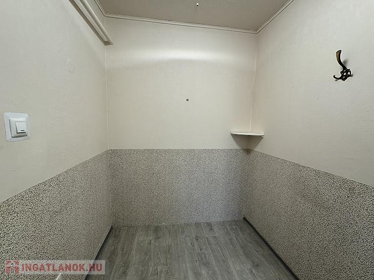 A szobákban és az előszobában laminált parketta található, a vizes helyiségek járólappal burkoltak, a szobák falai tapétázottak.