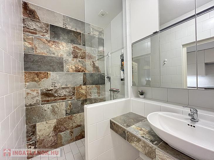 A fürdőszobában zuhanyzó van, a mosógép ki-és beállása ebben a helyiségben került kialakításra.