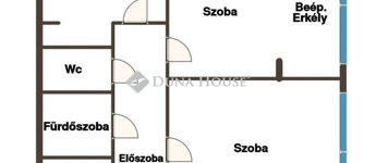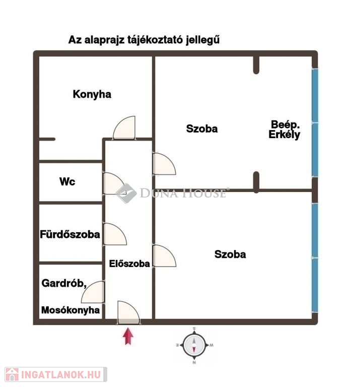 Az ingatlanban két különnyíló szoba, egy kamrarésszel is rendelkező konyha, egy fürdőszoba, mosógép fogadására is alkalmas mosókonyha és gardrób, egy külön wc, és egy előszoba helyiségek kaptak helyet. Az ingatlan kiváló belső elrendezéssel rendelkezik, fiatalok, összeköltöző párok, egyedülállók, idősek kisebb családok számára is ideális választás. A kisebbik szobából korábban erkély nyílott, mely beépítésre került, azonban ez könnyedén visszaalakítható, a korábbi erkélyajtó visszahelyezésével (az erkély beépítése teljes szélességében új, műanyag ablakokkal történt, melyek mindegyike nyitható)