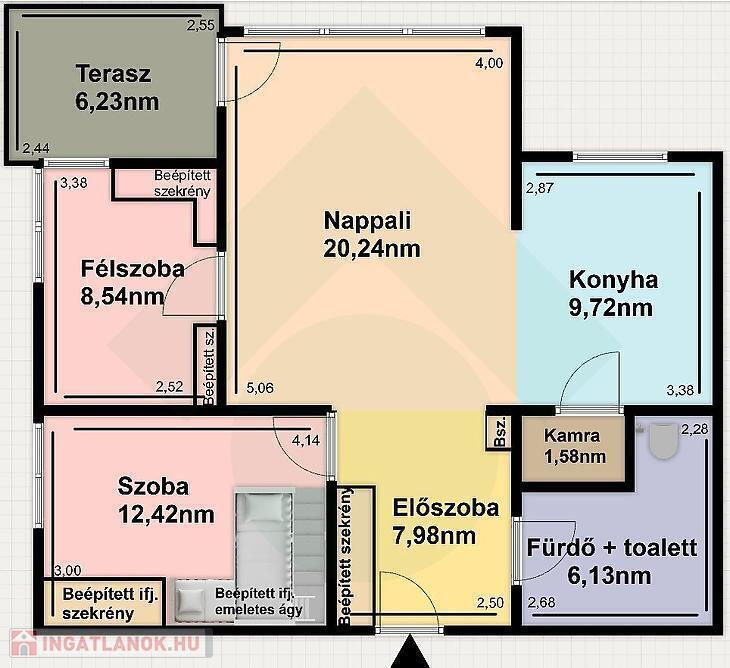 A beépített szekrények és a gépesített (mosogatógép, sütő) konyhabútor a vételár részét képezi.