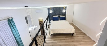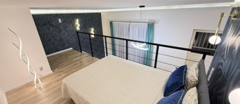 A szoba végéből kényelmes lépcső vezet fel a légies megjelenésű galéria szintre, ahol a franciaágyon kívül méretes gardróbszekrény is helyet kapott.