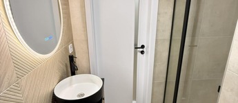 A galéria alatt, a 207 cm belmagasságú térben került elhelyezésre a méretre készült, gépesített konyha elektromos főzőlappal, sütővel, mikróval, kéménybe kötött páraelszívóval, mosogatógéppel, mosógéppel, beépített hűtővel felszerelve. Szintén innen nyílik a jó méretű, épített zuhannyal ellátott, dekoratív fürdőszoba.
