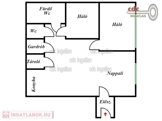 Az ingatlan helyiségei világosak és tágasak: nappali, két hálószoba, konyha, étkező, előszoba, gardrób, fürdőszoba, külön WC.