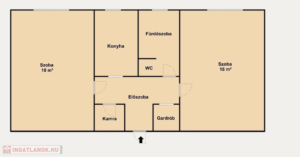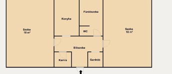 Az ingatlan kiváló elosztású: két külön nyíló, tágas, egyenként 18 m²-es szoba biztosít kényelmes életteret. A központi elhelyezkedésű előszobából nyílik a konyha, a fürdőszoba és a külön helyiségben található WC, ami praktikus megoldást jelent a mindennapokban. A lakáshoz kamra és gardrób is tartozik, így a tárolás könnyen megoldható.