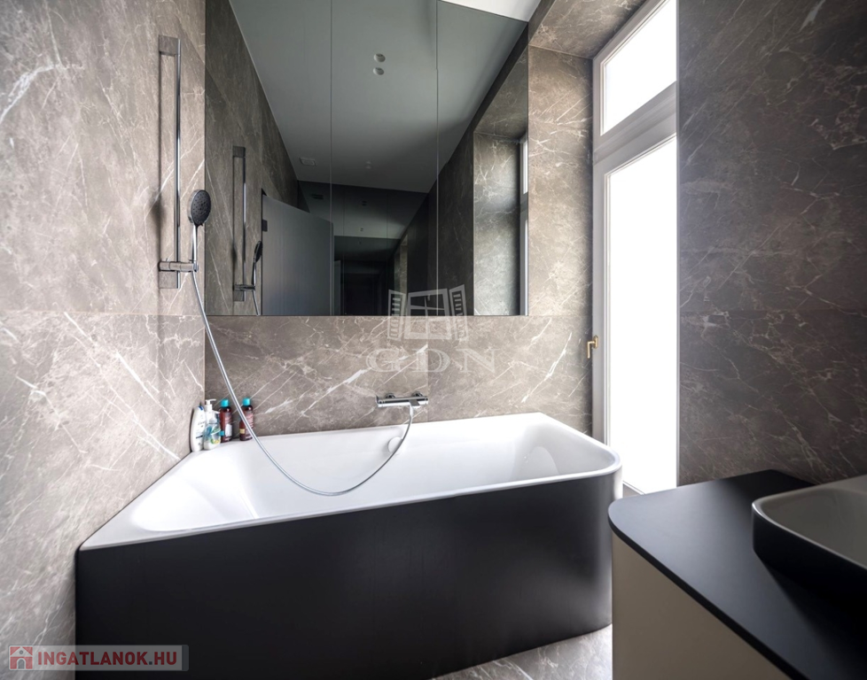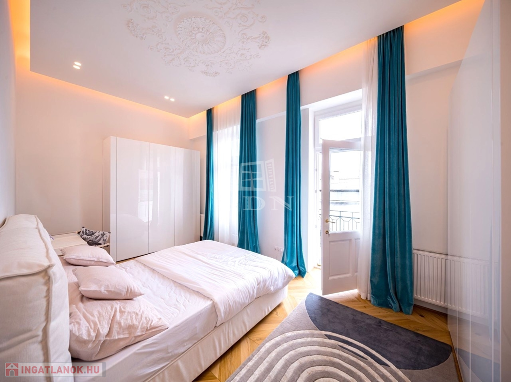 Flos lámpák, Loxone okosotthon-rendszer, 5 klíma, padlófűtés, Samsung Frame TV és 4K projektor teszik teljessé az élményt. A tágas erkély a csendes belső udvarra néz, a környék pedig a nyugalom és a belvárosi pezsgés tökéletes harmóniáját kínálja.