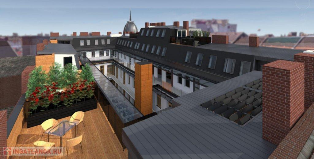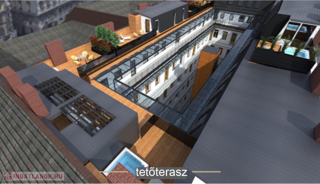 A felső szinten elhelyezkedő nagyméretű tetőterasz tökéletes választás lehet reggeli kávéhoz , napozáshoz vagy baráti összejövetelekhez . Az ingatlan egy neves építész, Petschacher Gusztáv tervei alapján készült házban található, ahol a régi idők eleganciája modern technológiával párosul.