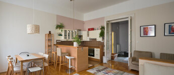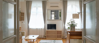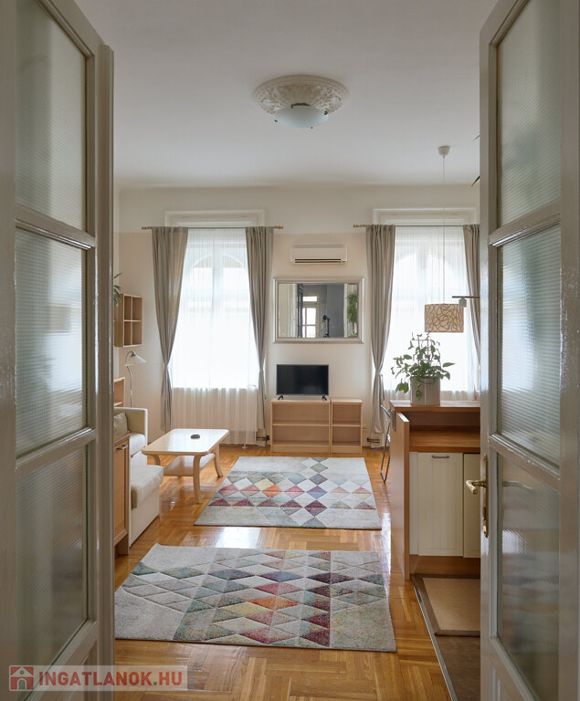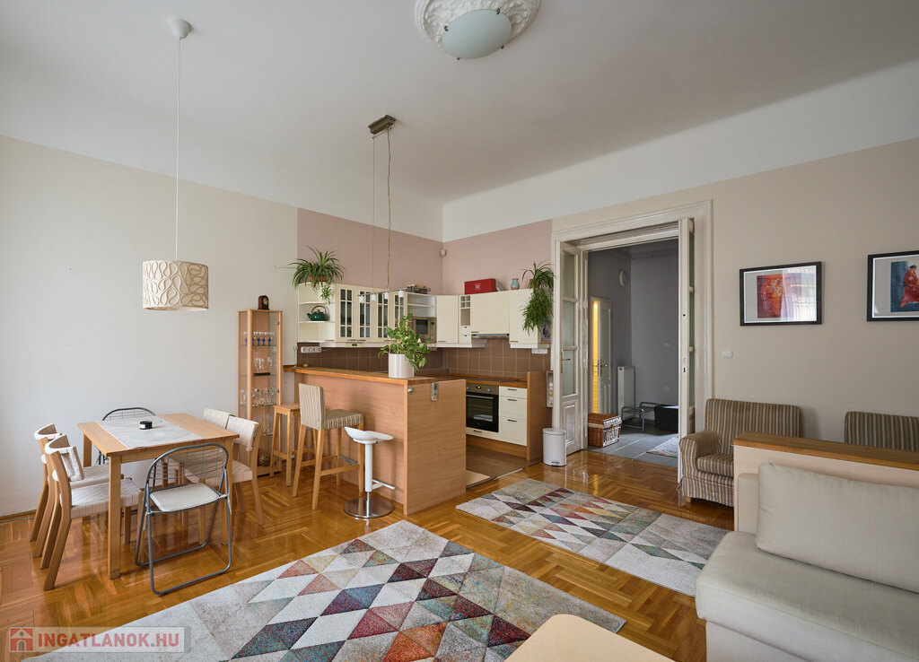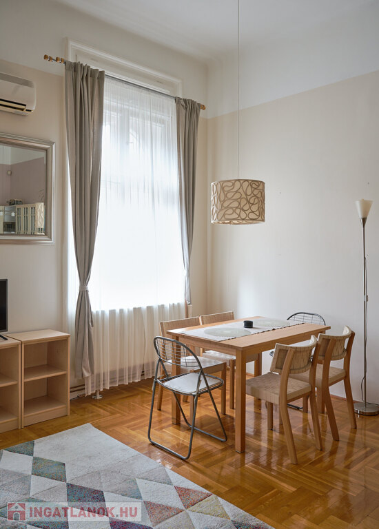 Budapest VI. kerületében, az Oktogon közvetlen szomszédságában, négyemeletes, liftes, rendezett ház 4. emeletén ELADÓ 55 m2-es, amerikai konyhás nappali, bútorozott és gépesített (hűtő-fagyasztó, elektromos tűzhely+sütő páraelszívó, mikrohullámú sütő, mosógép, TV), külön kényelmes háló. A fürdőszoba zuhanyzós. A lakás nappalija klímával felszerelt és az Aradi utcára néz így kifejezetten csendes.
