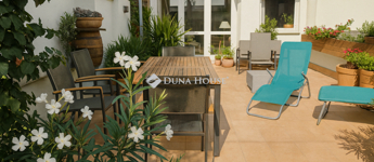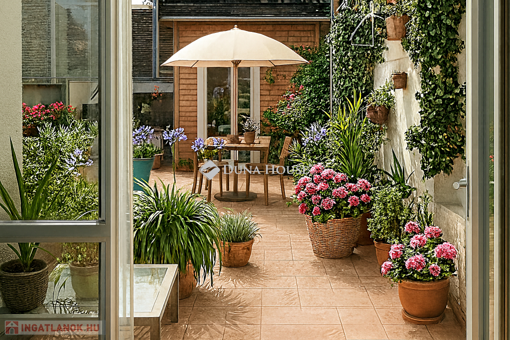 A teraszról páratlan panoráma nyílik a budai hegyekre és a város látképére tökéletes helyszín baráti összejövetelekhez vagy nyugodt pihenéshez.