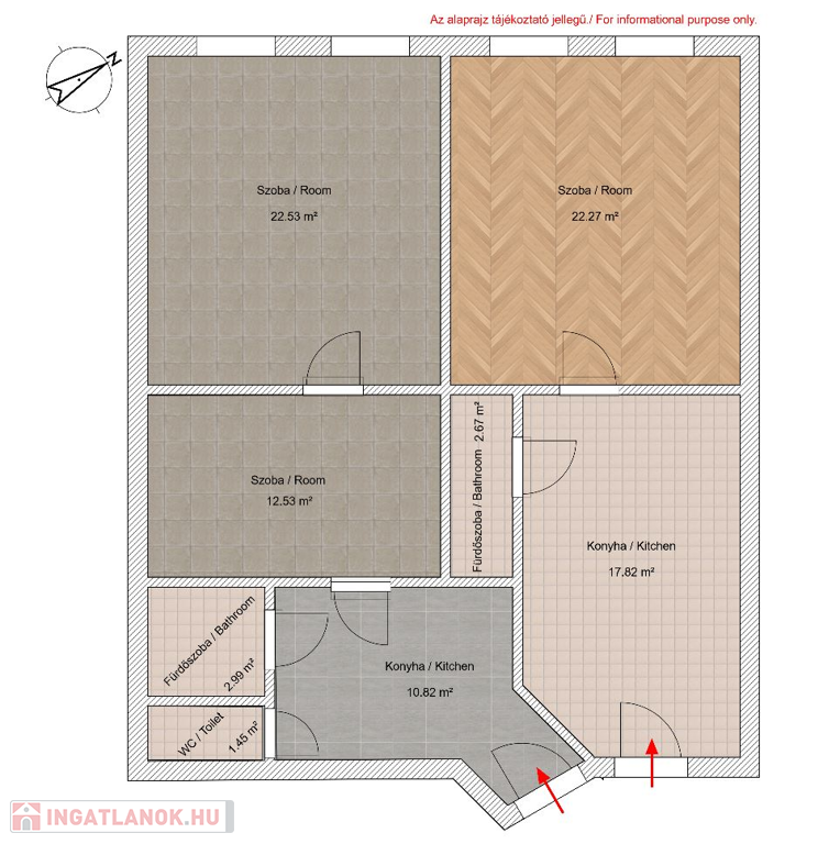 - Az egyik lakás egy igazi nagyvárosi otthon hangulatát idézi: világos, utcára néző ablakok, galériával megtoldott tágas szoba, étkezős konyha, külön fürdő és WC.