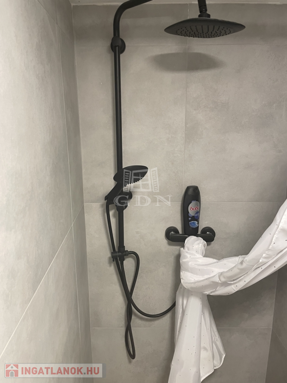 ✅ Fürdő: minőségi burkolatok, fekete dizájn szaniterek, zuhany, mosdószekrény, tükör, törölközőszárítós fűtőtest, villanybojler.