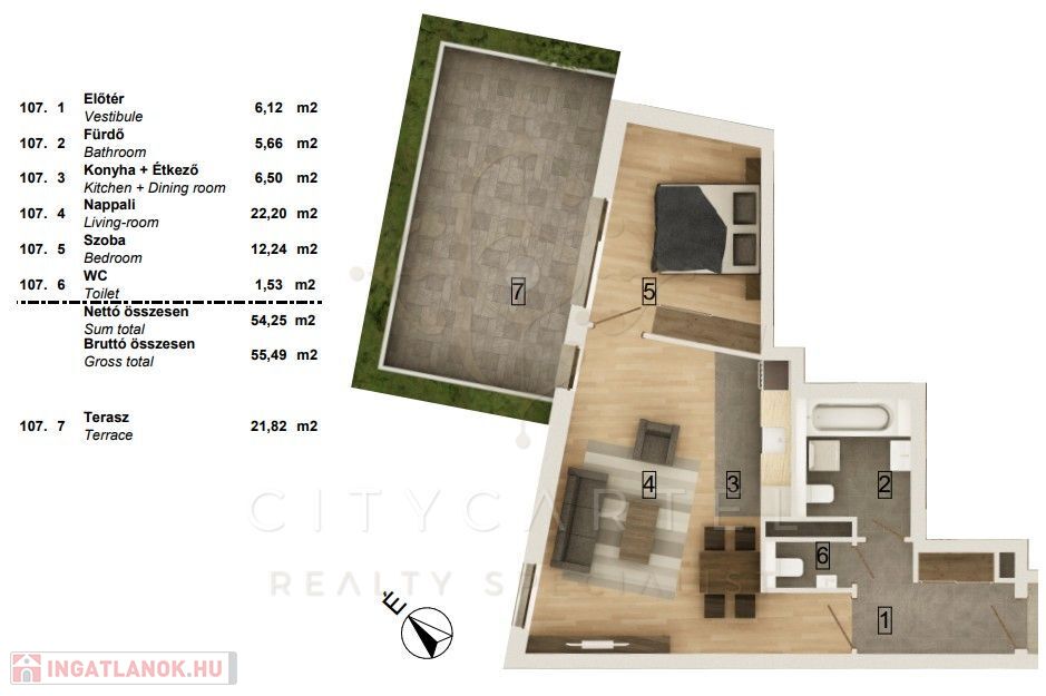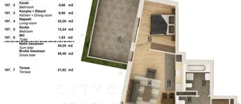 A liftes társasház 1. emeletén található, 58,23 nm-es, (54,25 nm lakás 21,82 nm terasszal) 2 szobás lakás korszerű hőszivattyús fűtés–hűtéssel és teljes körű okosotthon-rendszerrel felszerelve várja új tulajdonosát. A burkolatok még választhatók, így a leendő tulajdonos saját ízlésére szabhatja az ingatlant.
