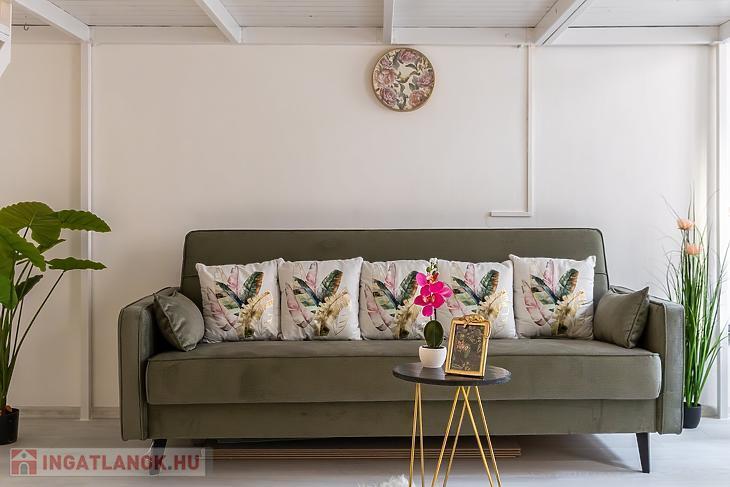 A fürdőszoba zuhanyzós, a konyha praktikus elrendezésű, étkezős méretű.