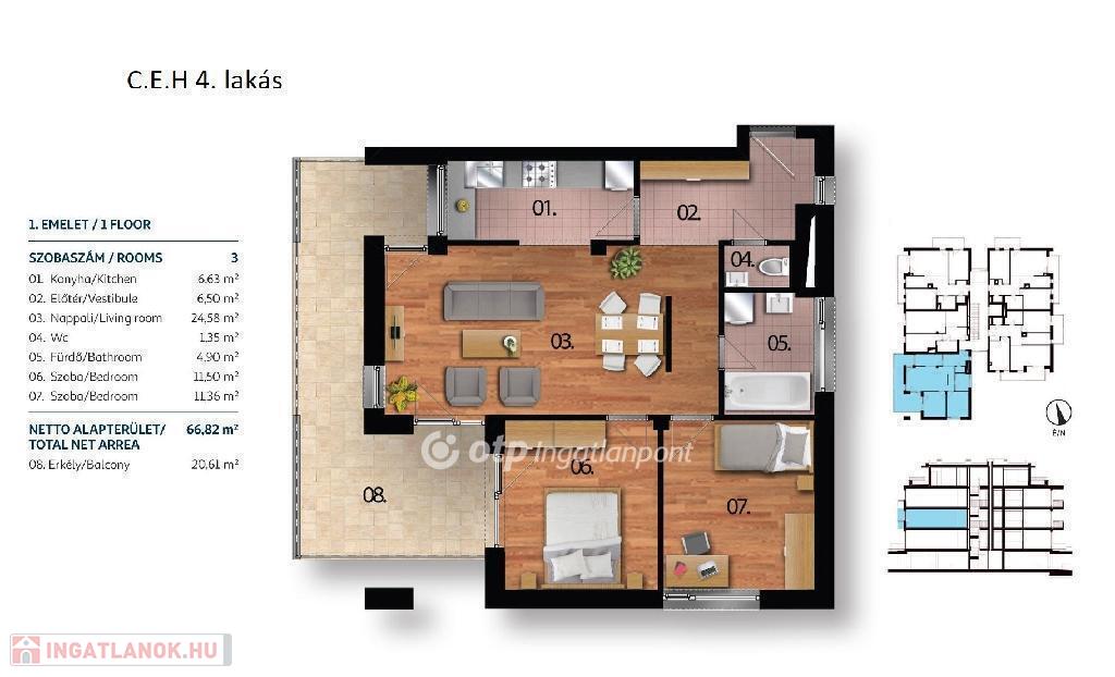 Lakások mérete: 43 nm-es, 1,5 szobás lakástól a 150 nm-es, 5 szobás és a tetőteraszos, exkluzív penthouseig.