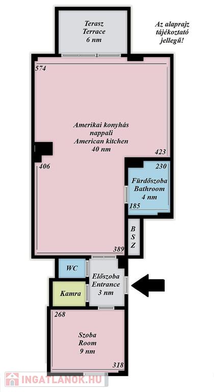 - Kertkapcsolatos, 5,5 m²-es terasz, ahonnan közvetlen kijárás nyílik a közös használatú kertbe