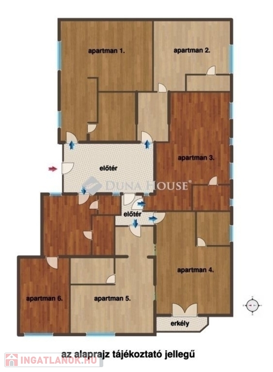 A 6 db apartman közel azonos méretű, 25-30 m2 közöttiek. Mindegyikhez tartozik saját zuhanyzós fürdőszoba és konyharész is. Három lakrész belső udvarra néz, a másik három pedig utcai kilátású. Az apartmanok műszakilag 8 évvel ezelőtt teljeskörűen fel lettek újítva, 2 évvel ezelőtt pedig esztétikai felújításon estek át. A fűtésről és a melegvízről közös gázkazán és nagy tárólókapacitású víztároló tartály gondoskodik.