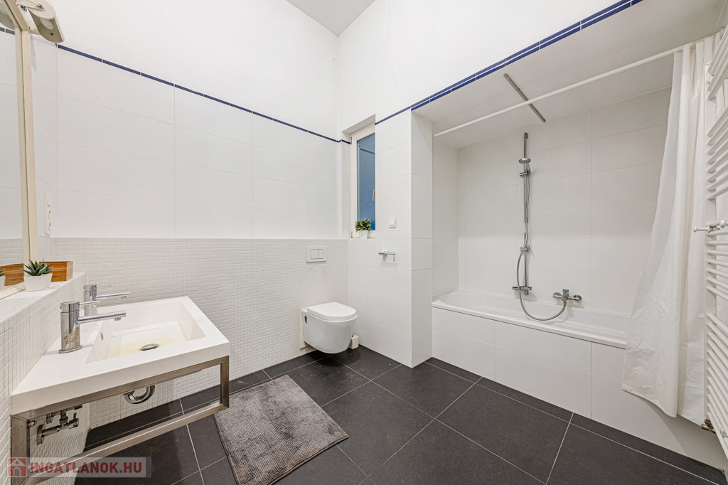 A kádas, elegáns fürdőszoba központi elhelyezkedésű, a mellékhelyiség külön kapott helyet a praktikum jegyében.