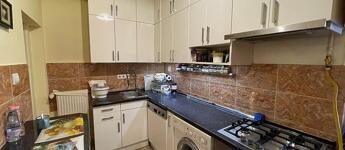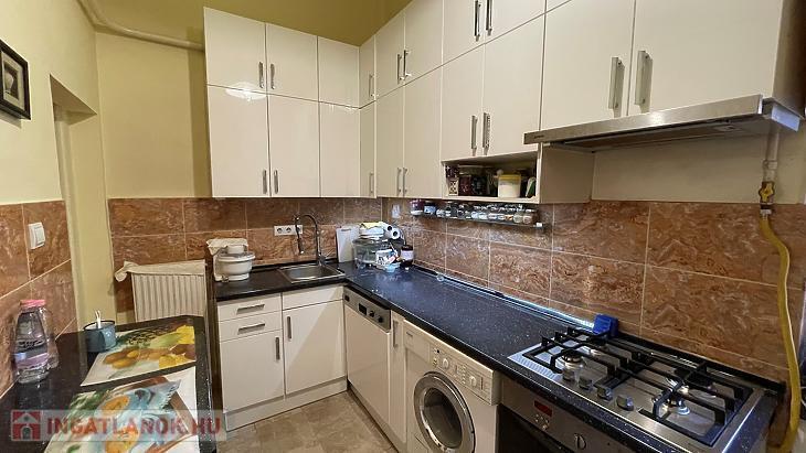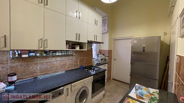 Konyhája ablakos, kényelmes méretű, és teljeskörűen gépesített.