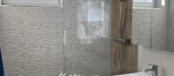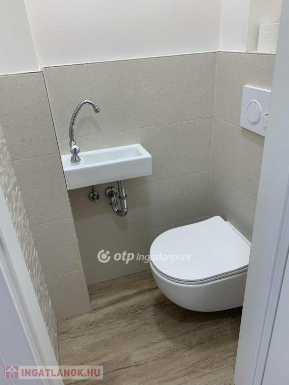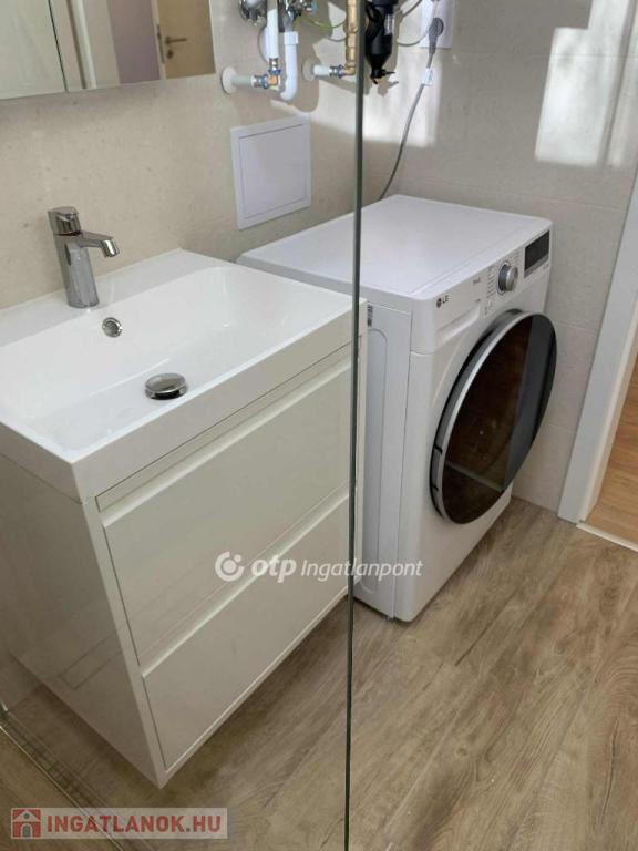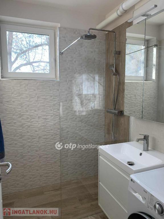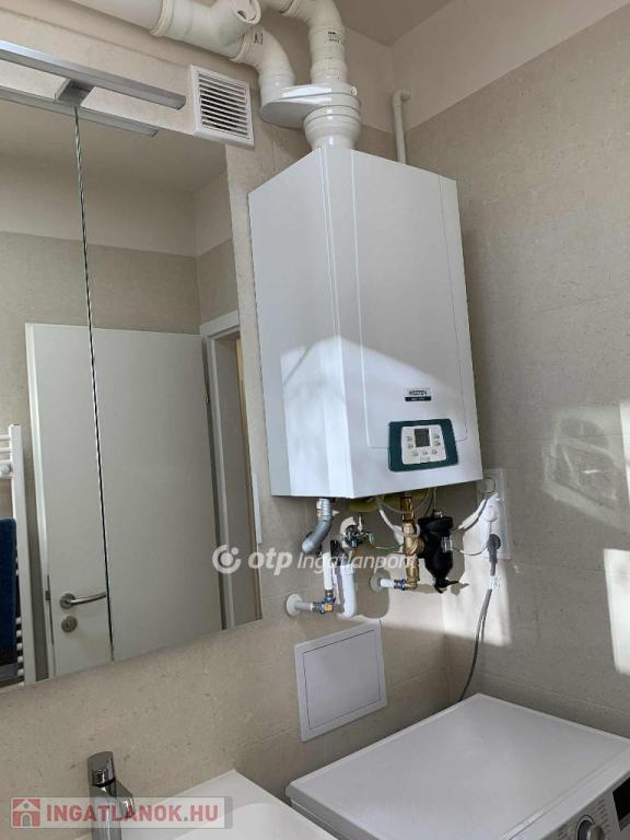 A fürdőszoba zuhanyzós, benne új mosógép és egy szintén új westen márkájú gázcirkó készülék, amely a melegvizet szolgáltatja és a lakás önálló fűtését, radiátoros hőleadással.