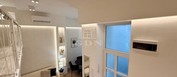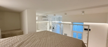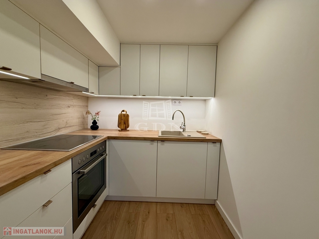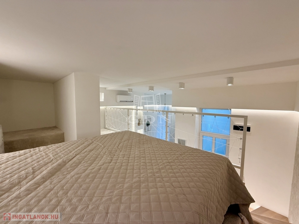A koncepció lényege az élhető tér kis alapterületen. A megfelelő belmagasság lehetővé tette a galériás kialakítást, így a nappali és hálófunkció elkülönül, ami érezhetően javítja a használhatóságot és a kiadhatóságot. Az anyaghasználat, a burkolatok és a gépészet nem kompromisszumos megoldások: tartós, időtálló, karbantartható elemek kerültek beépítésre.